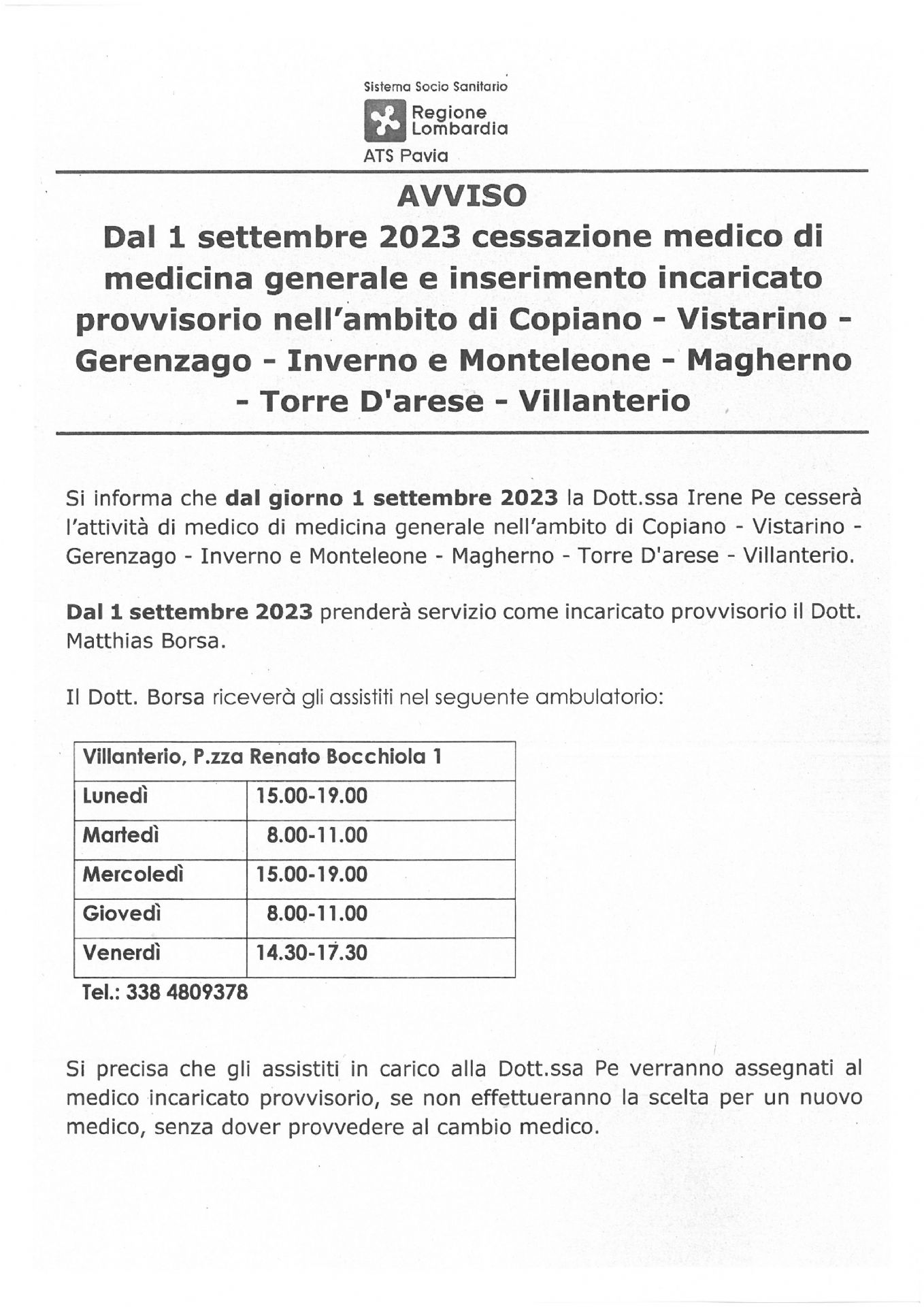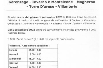 Dal 01 settembre 2023 cessazione medico di medicina generale e inserimento incaricato provvisorio nell'ambito di Copiano, Vistarino, Gerenzago, Inverno e Monteleone, Magherno, Torre d'arese, Villanterio