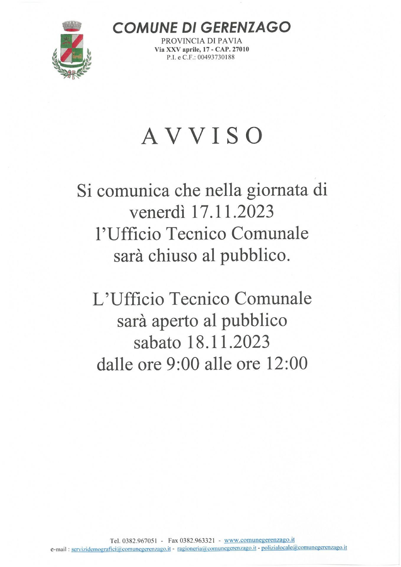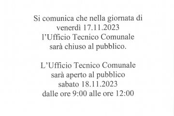 Variazione Orario Apertura Ufficio Tecnico